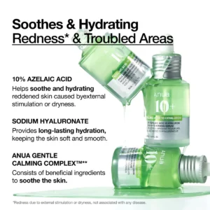 – Son acide hyaluronique délivre une hydratation durable et son Anua Gentle Calming Complex™ aide à apaiser la peau avec des ingrédients tels que l’huile de tanaisie bleue et l’eau de feuille de thé vert.