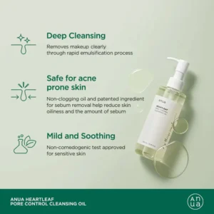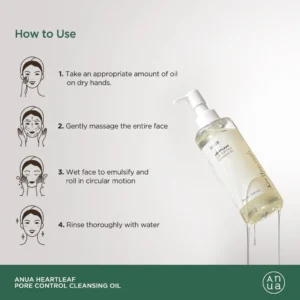 ANUA Heartleaf Pore Control Cleansing Oil est une huile nettoyante contenant des huiles végétales dont les huiles de jojoba, d’olive et de pépins de raisin. Sa formule non comédogène, débarrasse efficacement la peau des impuretés tout en laissant un fini rafraîchit et hydraté. Sa formule légère contient de l’extrait de feuille de cœur qui aide à prévenir les irritations.