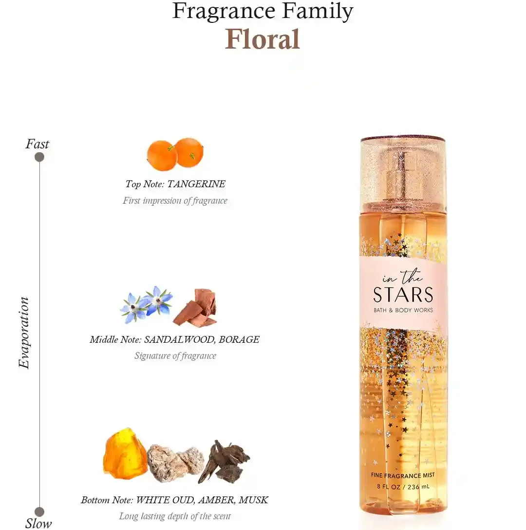 BATH & BODY WORKS In The Stars Mist est une brume avec un mélange chaud et étincelant de fleurs d’étoile, de musc de santal, de tangelo sucré, de bois d’agar blanc et d’ambre éclatant. Une brume divine qui sent un vœu doux et scintillant sur une étoile au milieu de la clairière.