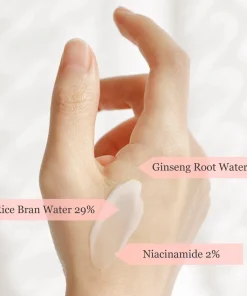– Eau de son de riz 29 % : Le son de riz est le son interne le plus fin du riz blanchi. Sous la dynastie Joseon, l’eau de son de riz était utilisée comme tonique d’aujourd’hui. On l’appelait « Eau de Beauté », utilisée pour une belle peau. Le son de riz, riche en acides aminés, minéraux et vitamine E, aide à garder la peau hydratée et saine.