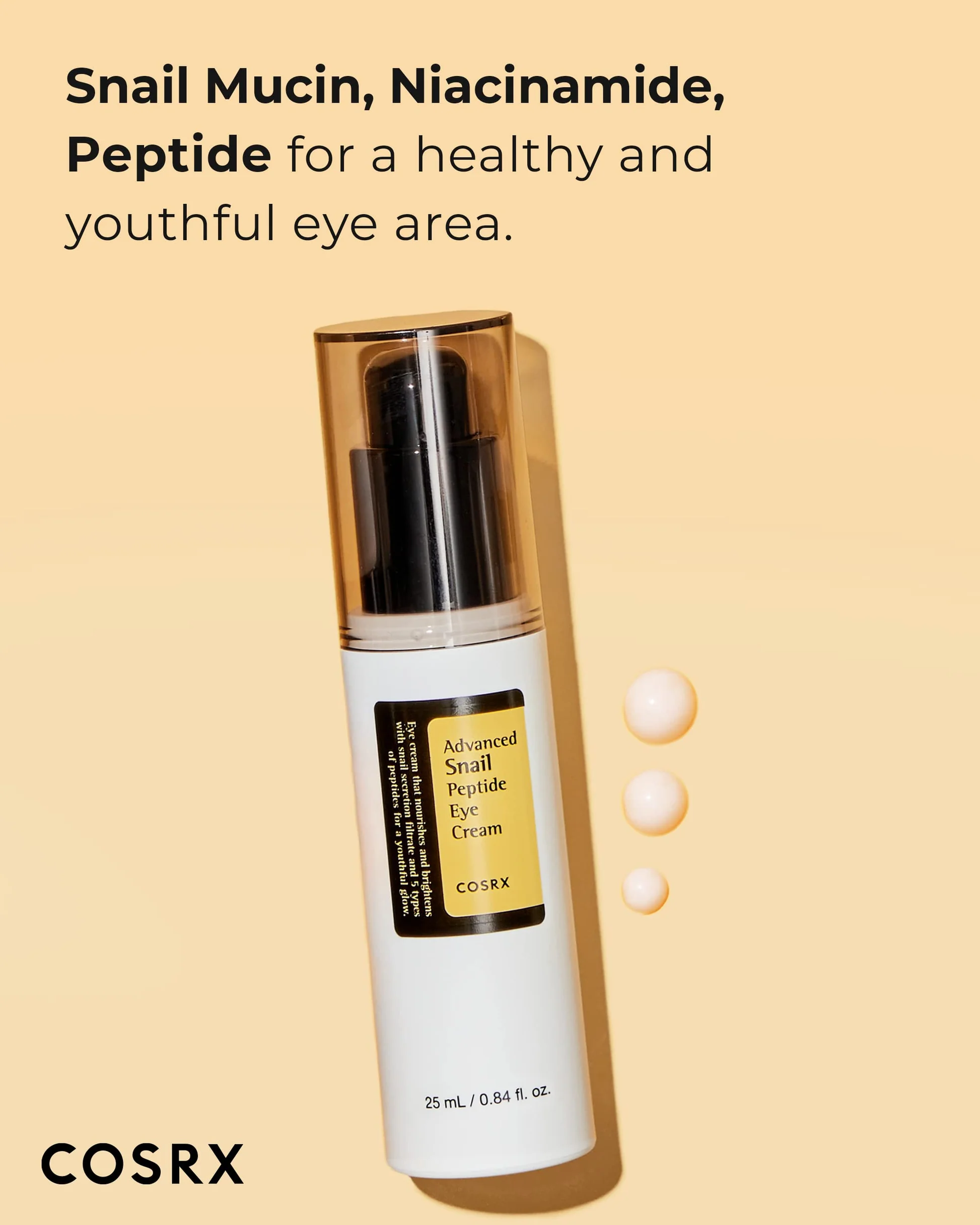 COSRX Advanced Snail Peptide Eye Cream est une crème pour les yeux qui nourrit et dégonfle le contour des yeux grâce à une sécrétion d’escargot filtrée et à 5 types de peptides tout en illuminant la zone ciblée avec de la nicotinamide pour un éclat de jeunesse.
