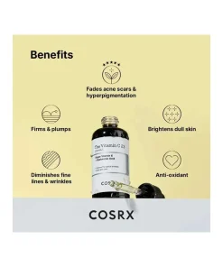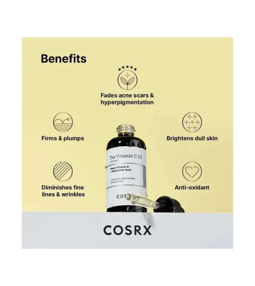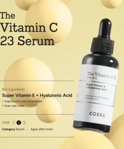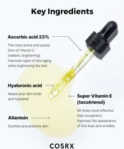 COSRX The Vitamin C 23 Serum est un booster éclaircissant antioxydant haute performance pour prévenir les premiers signes du vieillissement. Revitalisez votre peau avec ce sérum illuminateur enrichi à 23 % en vitamine C pure. Sa formule est également enrichie en dérivé de vitamine E riche en antioxydants pour booster les effets de la vitamine C, ainsi qu’en hyaluronate de sodium pour préserver le niveau d’hydratation de la peau. Enfin, il contient également de l’allantoïne pour apaiser les irritations de la peau.
