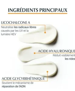 Une crème solaire visage fluide ultra-légère pour tous les types de peau, même les peaux sensibles. L’innovation de protection solaire Eucerin avec technologie spectrale avancée combine des filtres UVA/B pour une très haute protection contre les UV et la Licochalcone A pour la neutralisation des radicaux libres induits par les UV et la lumière visible à haute énergie. L’acide glycyrrhétique soutient le mécanisme de réparation de l’ADN de la peau.