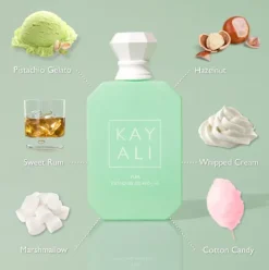 KAYALI Yum Pistachio Gelato 33 est Eau de Parfum Intense est une délicieuse explosion de notes irrésistibles et gourmandes : pistache, voluptueuse crème fouettée, noisette grillée, rhum doux, guimauve aérienne et barbe à papa acidulée. Un parfum vraiment délicieux qui envoûte par son sillage exquis d’une intensité inoubliable. Portez-le et vous serez à croquer !