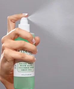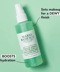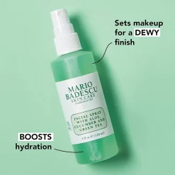 MARIO BADESCU Facial Spray with Aloe, Cucumber and Green Tea est une brume revigorante aux extraits de plantes, de concombre et d’eau de menthe poivrée pour les peaux ternes et fatiguées. Cette brume soulage et rafraîchit instantanément le visage et lui redonne de l’éclat!