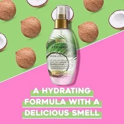 OGX Nourishing+ Coconut Oil Weightless Hydrating Oil Mist est un soin capillaire contenant de l’huile de coco et de l’extrait de bambou, qui hydrate efficacement vos cheveux et les rend plus doux. De plus, cette huile légère leur donne de la brillance sans les graisser ni les alourdir.