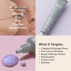 PAULA’S CHOICE Skin Perfecting 25 % AHA + 2 % BHA Exfoliant Peel est un peeling exfoliant doux multi-acides à rincer et à usage hebdomadaire qui régénère de façon spectaculaire la surface de la peau pour lisser visiblement l’apparence des rides, affiner les textures rugueuses et granuleuses, illuminer le teint et désobstruer les pores.