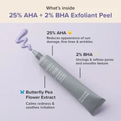 Cette formule gel liquide contient des ingrédients ultra-efficaces comme 2% d’acide salicylique (BHA) et un puissant mélange d’AHA composé de 8,4 % d’acide glycolique, de 7,1 % d’acide lactique, de 5% d’acide mandélique, de 2,5 % d’acide tartrique et de 2 % d’acide malique, pour resurfacer la peau à plusieurs niveaux. Dans le même temps, des extraits végétaux calmants aux propriétés prouvées par la Recherche comme l’allantoïne, le bisabolol et l’acide glycyrrhétinique apaisent la peau. L’extrait de fleur de pois papillon d’origine végétale vient quant à lui calmer et donner à la formule sa couleur lilas naturelle.