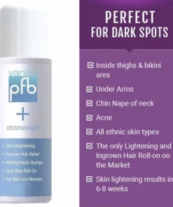 PFB VANISH Chromabright 93 g est formulé pour réduire la décoloration de la peau et l’apparence des tâches sombres causées par les poils incarnés, le feu du rasoir et des bosses résultant du rasage, épilation à la cire, épilation électrolyse et épilation au laser. Pour une utilisation sur le visage, le cou, les aisselles, les jambes et l’intérieur des cuisses et du bikini.