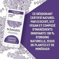– Vraiment naturel. Vraiment efficace: Schmidt’s Lavender & Sage aide à neutraliser les odeurs et préserve la fraîcheur avec 24 heures de protection contre les odeurs.