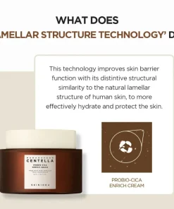 SKIN 1004 Madagascar Centella Probio-Cica Enrich Cream est une crème riche et onctueuse à base de Centella asiatica fermentée, de beurre de karité et de céramide NP, qui offre une hydratation intense sans effet lourd ni collant.