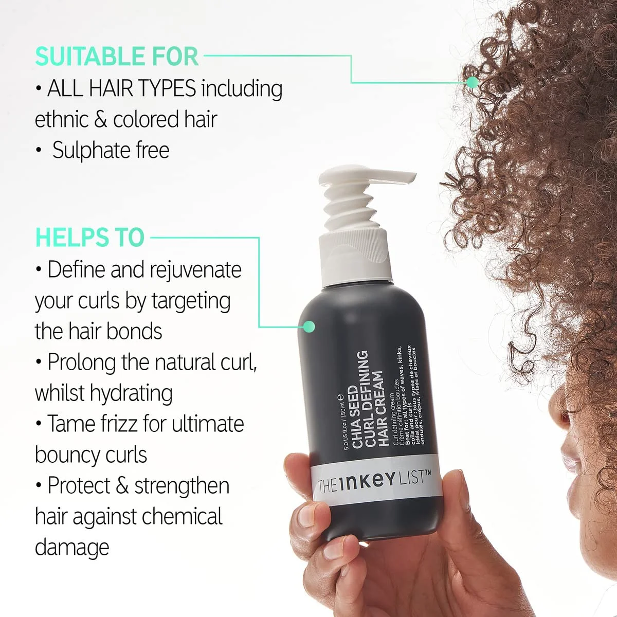 THE INKEY LIST Chia Seed Curl Defining Hair Cream set un soin léger spécialement formulé pour les cheveux bouclés et frisés, qui permet de définir, d’allonger et d’hydrater les boucles.