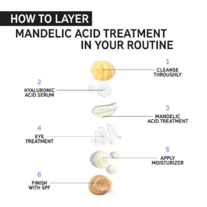 – L’acide mandélique 10 % est un acide alpha-hydroxylé (AHA) issu de l’amande amère, dont la grande taille moléculaire également convient aux peaux sensibles, avec des propriétés inhibitrices sur la mélanine qui permettent de réduire efficacement les tâches, l’hyperpigmentation et les imperfections.