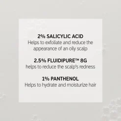 Afin de traiter les démangeaisons, les desquamations et l’accumulation excessive de sébum, nous avons créé un sérum léger qui associe 3 ingrédients clés. L’acide salicylique permet d’éliminer l’accumulation en exfoliant délicatement le cuir chevelu. Les deux autres ingrédients, FLUIDIPURE™ 8G et le PANTHÉNOL, aident respectivement à réduire les rougeurs sur le cuir chevelu et hydrater les cheveux.