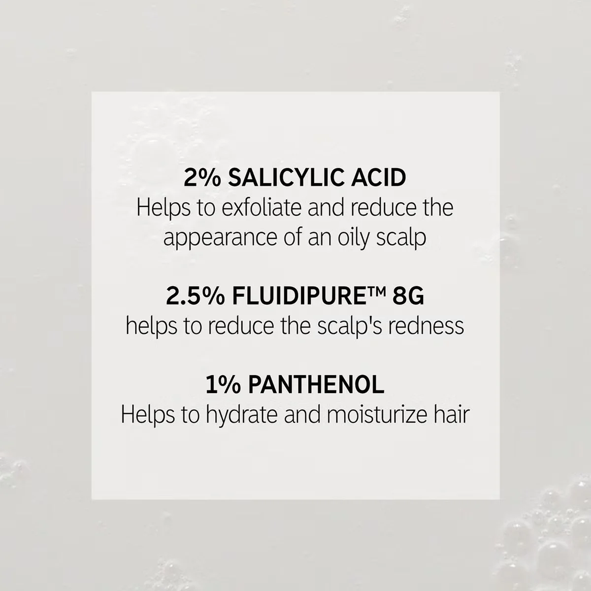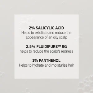 Afin de traiter les démangeaisons, les desquamations et l’accumulation excessive de sébum, nous avons créé un sérum léger qui associe 3 ingrédients clés. L’acide salicylique permet d’éliminer l’accumulation en exfoliant délicatement le cuir chevelu. Les deux autres ingrédients, FLUIDIPURE™ 8G et le PANTHÉNOL, aident respectivement à réduire les rougeurs sur le cuir chevelu et hydrater les cheveux.